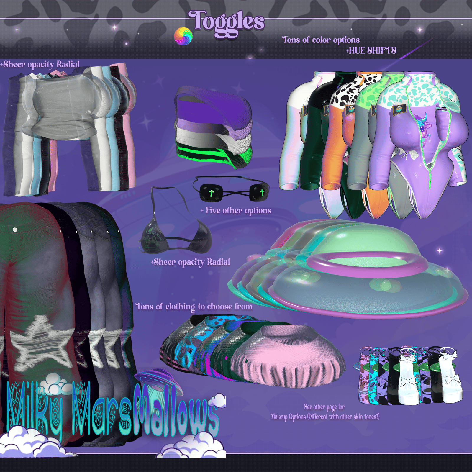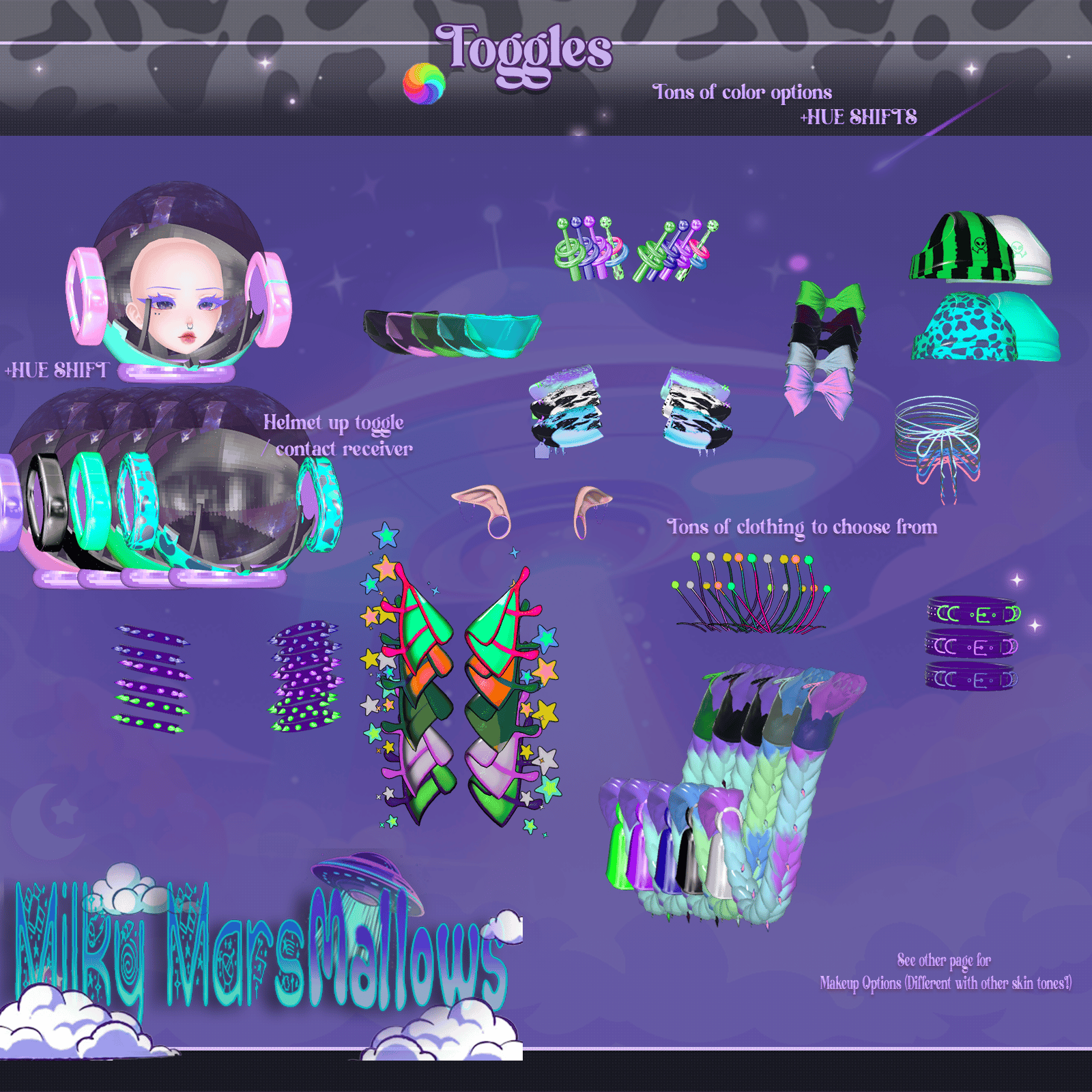Head ( edited by Spooky NO REUSEEE)| Base Heavily edited by Spooky NO REUSE | Hairs, clothing -acc | Hairs, tops, pants | Hair | Ears | Skirt | Shoe bits | Ears and tail | Antenna | Heels| Helmet| arm cuff | ears | Panties | Edits, Emissions, Hair textures all Done by Shipwreck and Spooky unless stated otherwise. Base edited by Spookiness DO NOT REUSE OUR TEXTURES, MATCAPS, OR EDITS OF ITEMS.