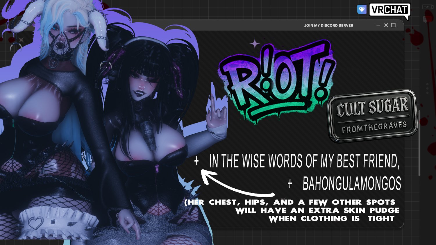 Head (heavily edited by Spooky NO REUSEEE)| Base Heavily edited by Spooky NO REUSE | Hairs | Hairs | Hair | Hair | glasses| Bikini, shirt, pants, assorted accessories | Shoes Gloves | Shoes | outfit + random accessories |blade | Panties, accessories | ears | Horns | Tail and ears | Muzzle | Shield | Razer Sword | Edits, Emissions, Hair textures all Done by Shipwreck and Spooky unless stated otherwise. Base edited by Spookiness DO NOT REUSE OUR TEXTURES, MATCAPS, OR EDITS OF ITEMS.